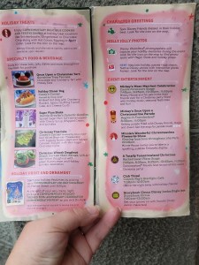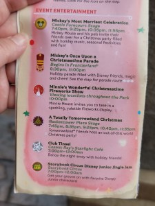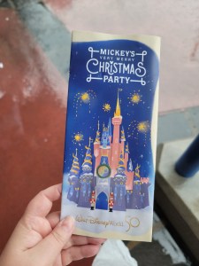 Mickey’s Very Merry Christmas Party is an exclusive ticketed event that is brought to the Magic Kingdom for select nights. All members of your party (ages 3+) must have a party ticket to have access. Starting at 4pm, you will get your wristband and be able to enter the park. They will also give you a map for the party. This gives you an itinerary to base your night off of. From character sightings, attraction overlays, parade times, exclusive snacks/drinks, etc. Check out this year’s party map below.