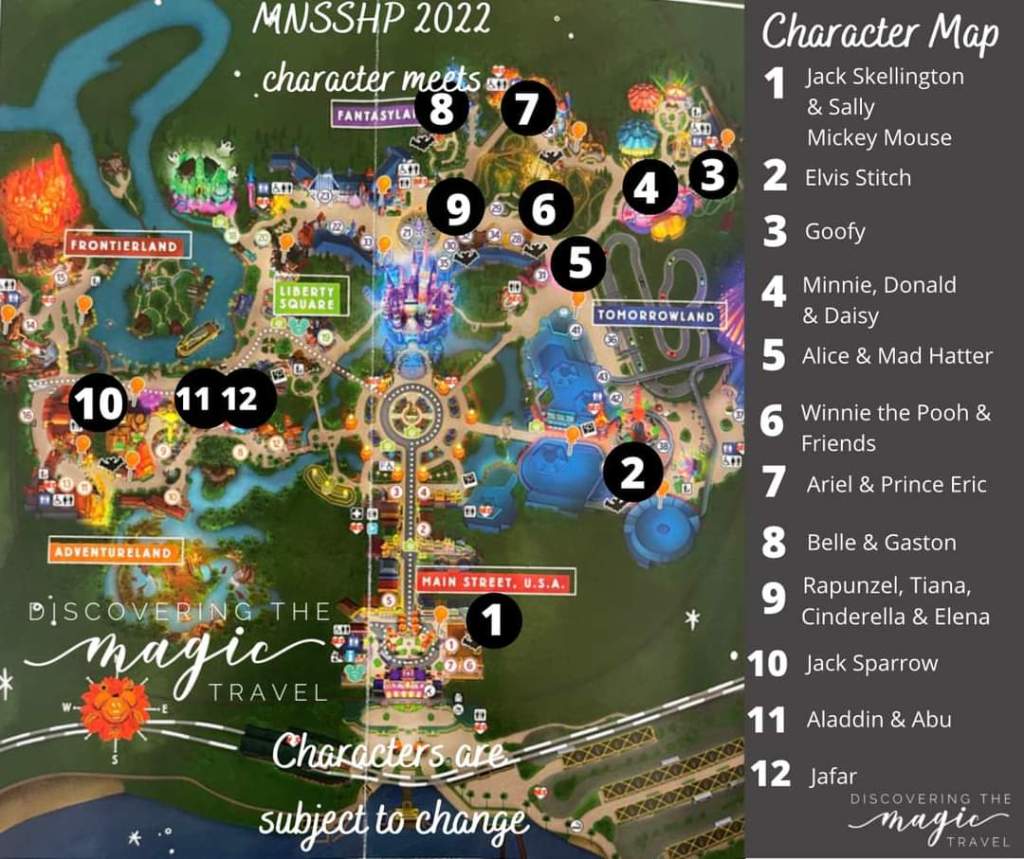 Come prepared to meet some rare characters. Here’s a list and map from MNSSHP 2022. Keep in mind, characters and locations may change for 2023. We love seeing our favorite Disney friends dressed in their Halloween costumes. This party is one of the only opportunities to meet Jack and Sally. This line can get long. So if this is a priority to you, we recommend you get in line at the start of the party.