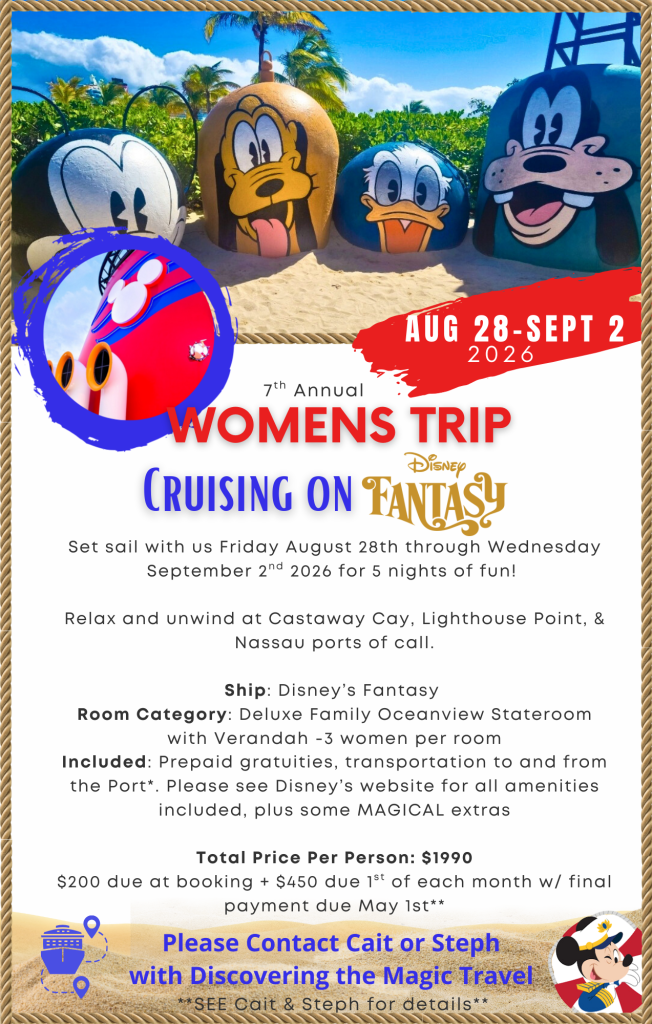 Hosting six fantastic Women Only group trips has been an absolute joy. We are gearing up for our 7th trip in August 2026. This time we are setting sail on Disney Cruise Line! Women from all corners of the country have come together, stayed as a united group, and had an incredible time. Whether you plan to attend solo or you want to bring along a friend, there’s a spot waiting for you.